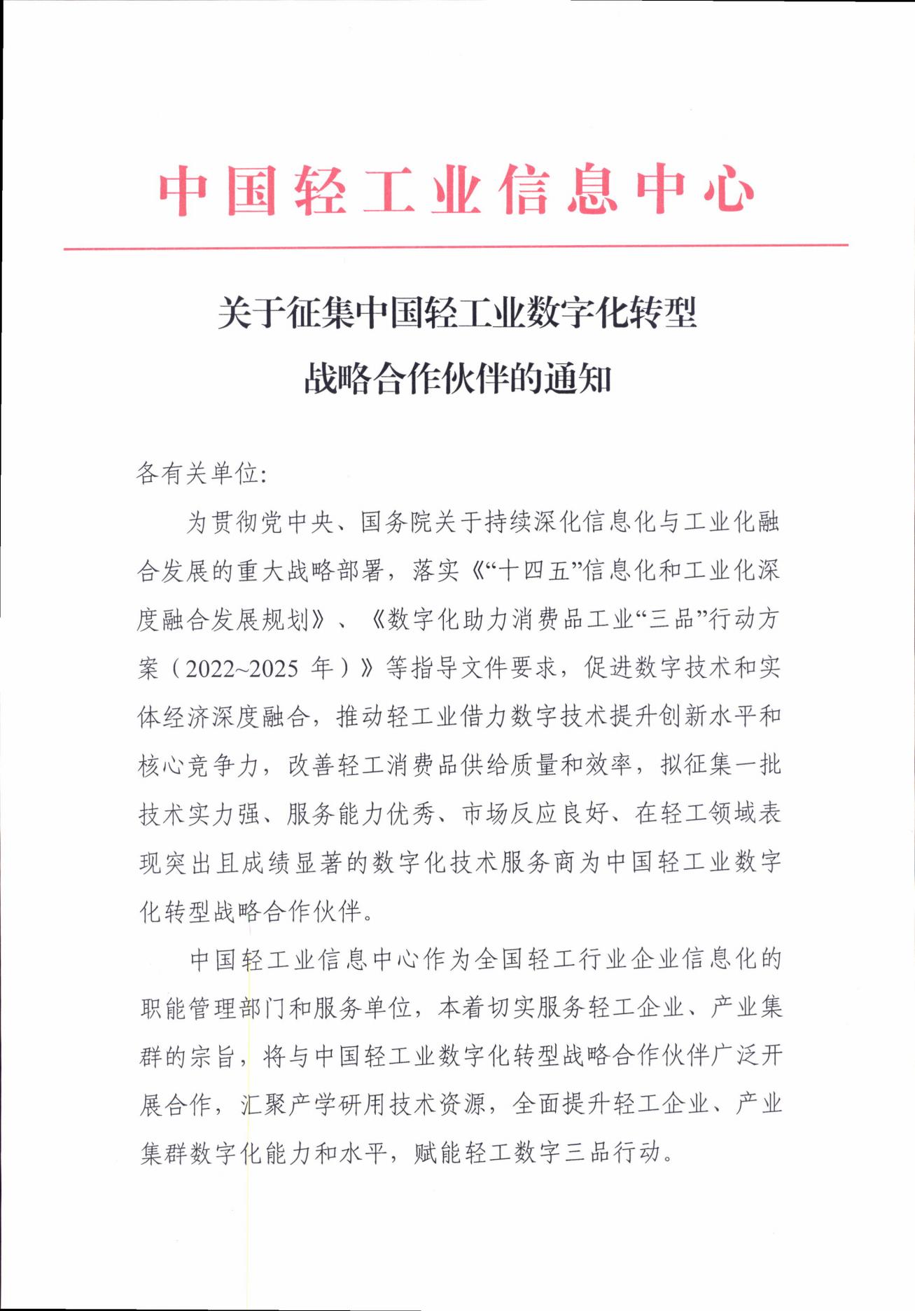 | 1、 | 关于征集中国轻工业数字化转型战略合作伙伴的通知 |