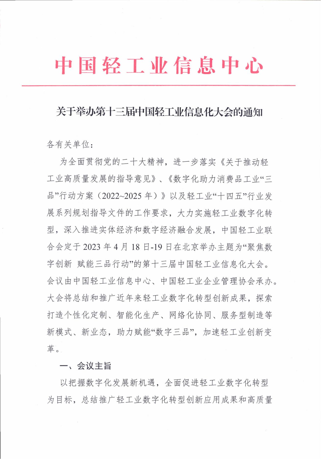 定于2023年4月18-19日在北京举办主题为“聚焦数字创新 赋能三品行动”的第十三届中国轻工业信息化大会。会议由