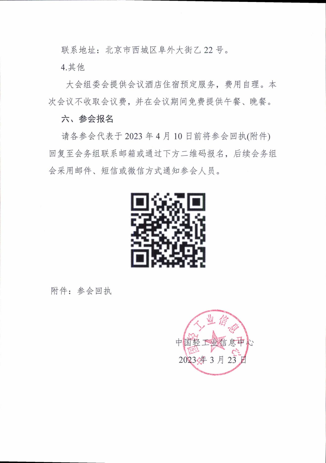 请各参会代表于2023年4月10日前将会议回执(附件)回复至会务组联系邮箱或通过下方二维码报名,后续会务组会采用邮件、短信或微信方式通知参会人员。