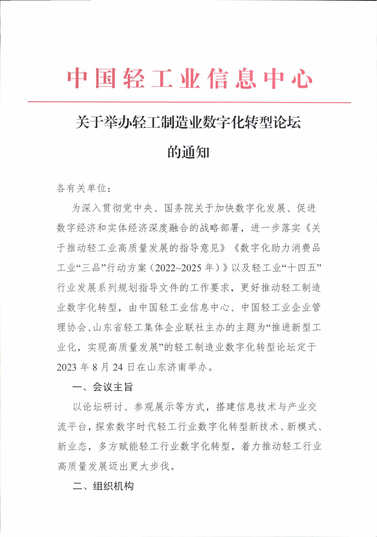 、中国轻工业企业管理协会、山东省轻工集体企业联社主办的主题为“推进新型工业化,实现高质量发展”的轻工制造业数字化转型论坛定于2023年8月24日在山东济南举办。
