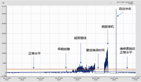 如下图所示,某机床通过振动分析,可以看到10月18日振动加速度峰值触发早期预警阈值,但是由于生产计划问题,没有停机维护;10月22日机床主控系统触发故障,不得不停机过10个小时维修和更换轴承,维修后,振动恢复正常水平,但较大损失已经造成。