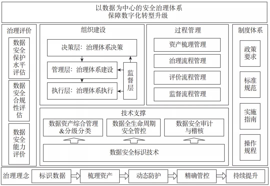 (3)技术支撑:以数据安全标识技术为基础,基于数据全生命周期安全管控、数据资产综合管理、数据安全审计与稽核等技术,为数据安全治理体系提供技术支撑。
