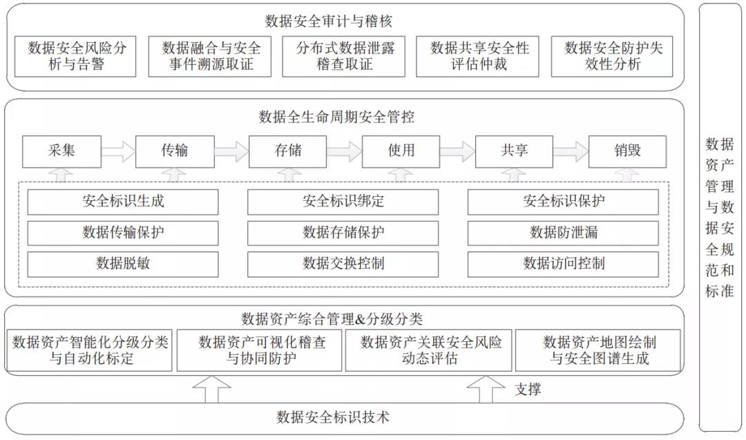 数据安全治理技术架构以数据安全标识技术为基础,以数据资产管理与数据安全标准规范为基准,依托安全标识的生成、编码、绑定、保护等技术手段,围绕数据采集、传输、存储、使用、共享、销毁等全生命周期处理流程,从数据资产综合管理与分级分类、数据全生命周期安全管控、数据安全审计与稽核三方面展开数据的安全防护与治理,实现数据资产安全态势可展现、数据安全风险可感知、数据细粒度安全策略可运维、数据安全保密防护可协同、数据防护水平可评估、数据安全事件可追溯,为加快数据资源层形成和应用创新能力形成提供技术保障。