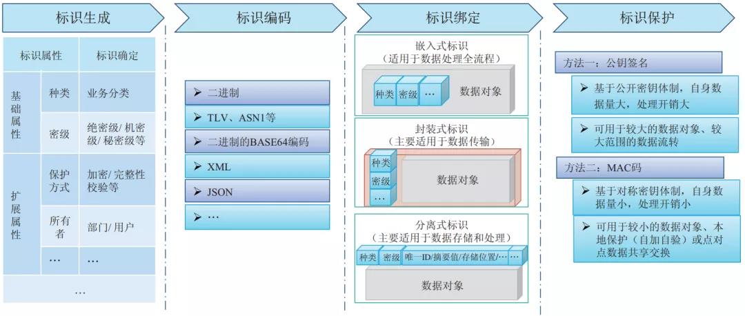 4.2 数据安全治理技术4.2.1 数据安全标识技术面向数据安全治理的数据安全标识技术是一种基于密码技术的高安全、高可信和高可用的数据属性标注与识别技术,为数据全生命周期管控提供支撑(见图3)。数据安全标识是与数据对象安全性相关的属性,包括数据密级、数据种类、数据保护方式、数据摘要值、数据责任人等,将数据安全标识属性分为基础属性和可扩展属性。数据密级、数据种类是最基本的安全标识,是数据对象安全防护措施、知悉范围控制的基本依据。数据安全标识处理包括安全标识生成、标识编码、标识绑定和标识保护。