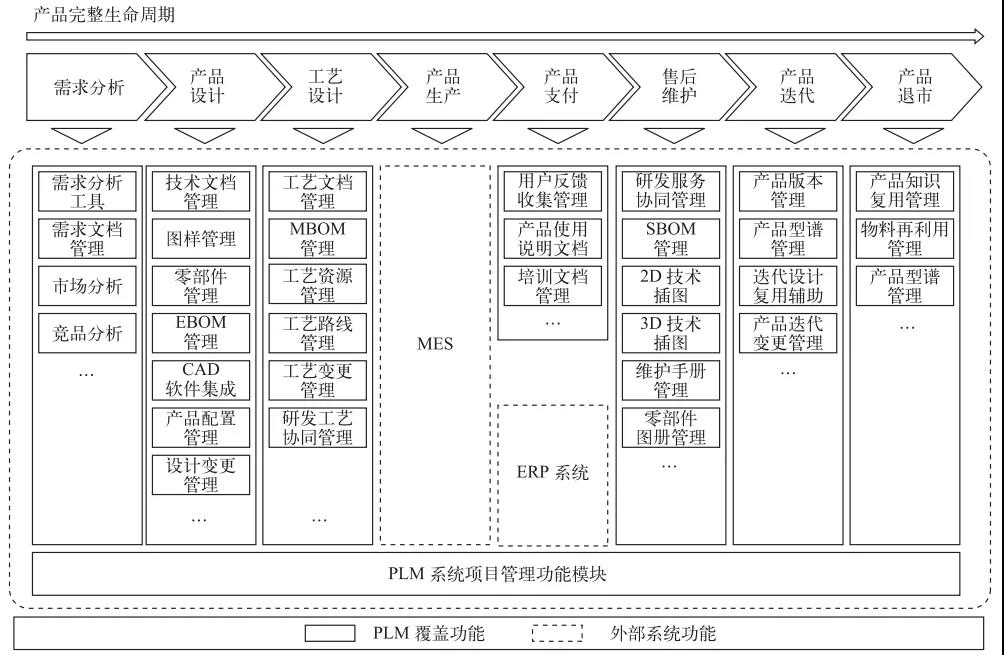 产品生命周期管理系统 (Production Life-cycle Management,PLM) 是传统产品信息管理系统 (ProductData Management,PDM)在功能上的延伸。其与企业资源管理系统 (Enterprise Resource Planning,ERP)一样是企业数字化转型中的重要支柱,区别在于,PLM 管理的对象是所有与产品相关的数据,其管理涵盖产品的整个生命周期,其中不仅包括图样、BOM 和生产工艺等,还囊括了需求管理、产品供应链管理、产品售后维护和项目管理等,其具体功能结构如图2所示。
