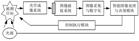 视觉识别和定位技术是一项涉及人工智能、图像处理、传感器技术和计算机技术等多领域的综合技术,与工业机器人结合非常紧密,广泛地应用在工业生产中的缺陷检测、目标识别与定位和智能导航等方面。典型的视觉应用系统包括图像捕捉、光源系统、图像数字化模块、数字图像处理模块、智能判断决策模块和机械控制执行模块,如图6所示。