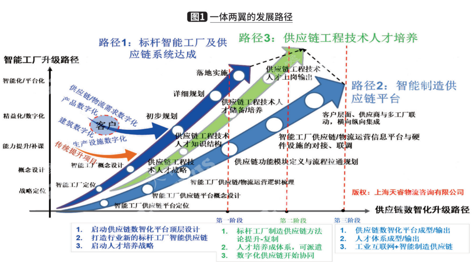 制造供应链数智化的建设和发展,伴随着企业智能工厂的建设和发展同步进行。不同发展阶段的建设和发展切入点、着力点、目标都不一样。从企业运营、参与竞争以及两化融合的大趋势而言,建议采用“一体两翼”的发展路径,如图1所示。