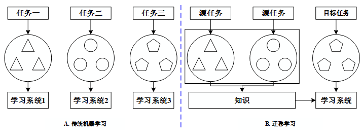(3)迁移学习:指一种学习或学习的经验对另一种学习的影响,以深度卷积神经网络为基础,通过修改一个已经经过完整训练的深度卷积神经网络模型的最后几层连接层,再使用针对特定问题而建立的小数据集进行训练,以使其能够适用于一个新问题。其放宽了传统机器学习中的两个基本假设,目的是迁移已有的知识来解决目标领域中仅有少量甚至没有有标签样本数据的学习问题。图4给出了传统机器学习和迁移学习过程的差异。