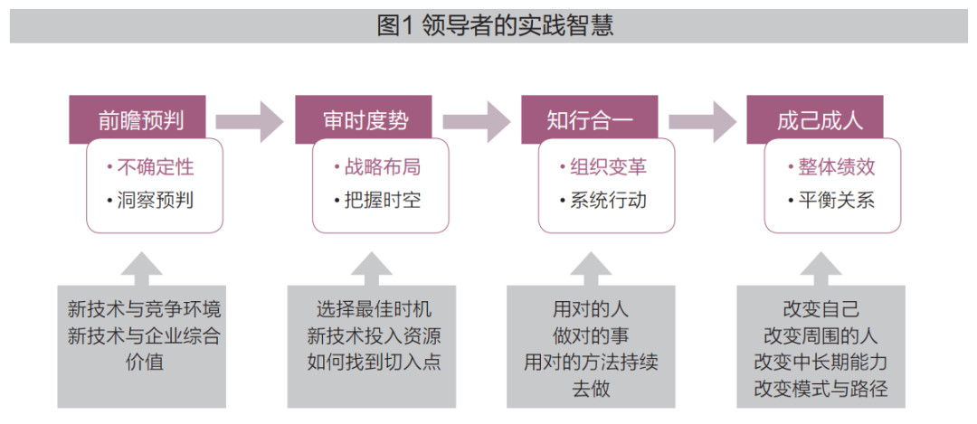 企业数字化转型中,领导者的新实践智慧呈现为:面对不确定性,能够作出价值预判;能够审时度势,制定战略,寻求转型的时机和切入点;能够在组织内部进行布局,采取行动并持续推进;能够将技术转化为核心能力,并对外赋能,打造生态系统。