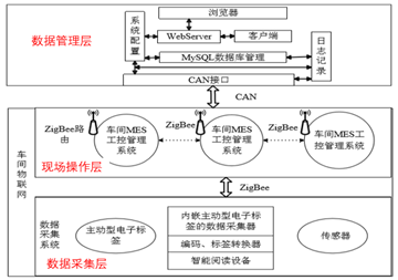 基于车间物联网,可以构建一种如图2所示的MES生产监控系统框架。该框架由三层组成:数据采集层、现场操作层、数据管理层。