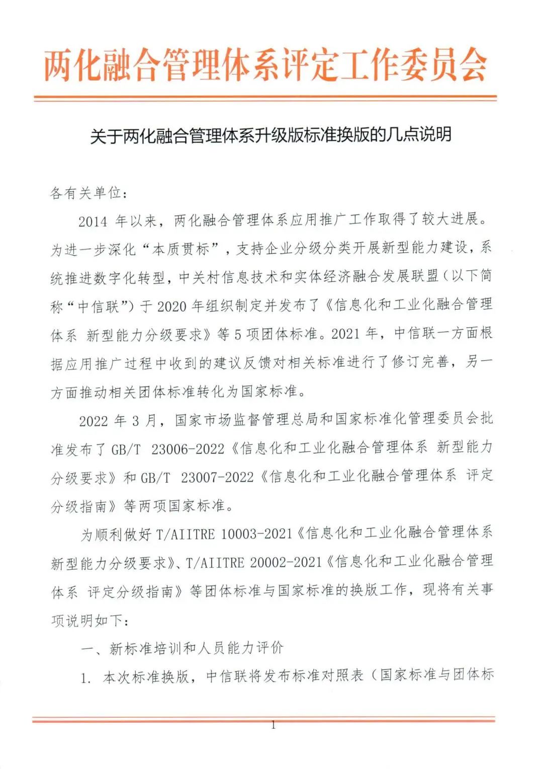 关于两化融合管理体系升级版标准换版的几点说明