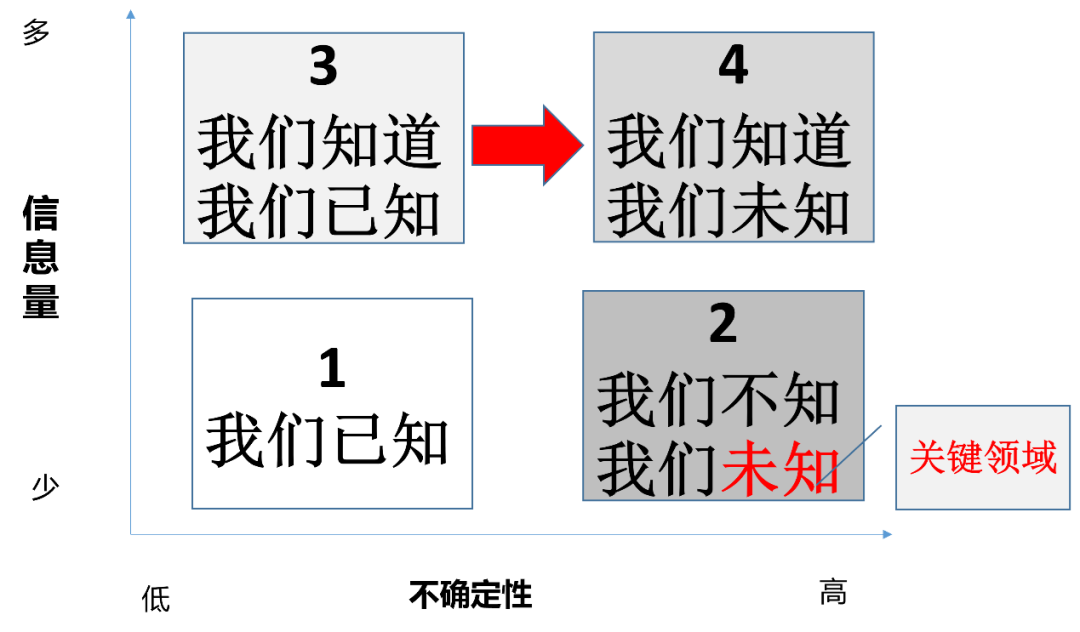在图2中,我们根据不确定性和信息量两个维度画了一个矩阵,在这个矩阵中,第二象限决策压力挑战最大,一方面,我们对未知领域掌握的知识很少,更困难的是,有些正在发生的事情是在我们认知框架之外的事情,无论是突破式创新,还是突发危机事件,都有可能对未来产生重大影响,这是当前知识管理和企业数字化转型中需要解决的关键课题。