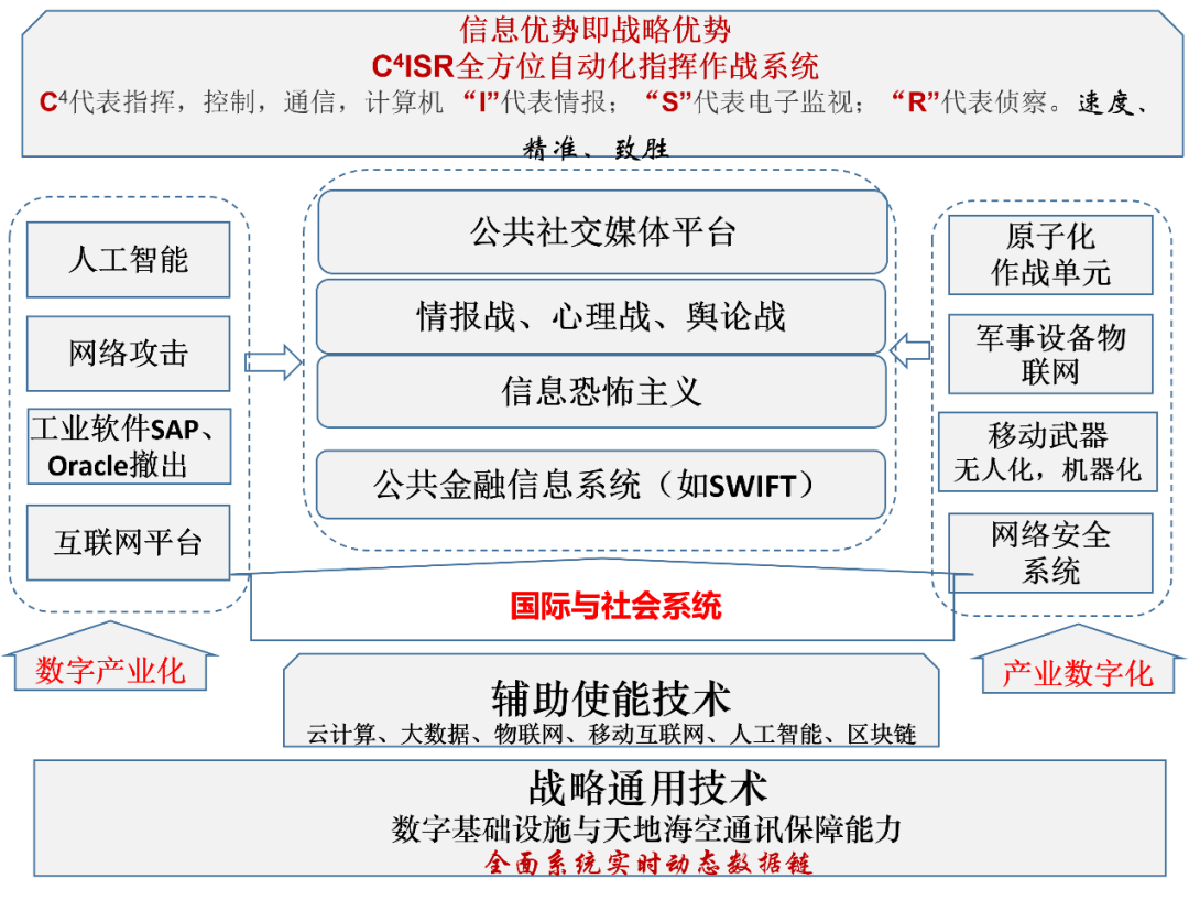 数字化转型其实已经有四五十年的历程,只不过在不同的阶段,都有一些新的概念的出现,这是我们对中国的数字强国,以及中国的数字经济发展提出的一个整体的框架。参照这个框架,我们以此次俄乌战争中数字化技术的应用为例,来看看数字技术应用的范围和领域,以促使我们加深对数字化技术渗透力的理解(图3)。