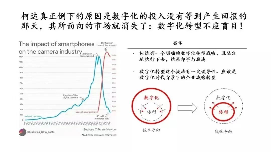 下图很能说明问题。在不到10年的时间内,柯达为转型投入了近30亿的资金,但数字化相机的市场很快被智能手机所替代,这是非常戏剧化和极端的情况。我认为柯达过于相信数字化转型了,坚定地认为数字化相机就是未来,但没能预测到智能手机会颠覆数码相机。由此看见,柯达的失败是技术导向思维的结果。