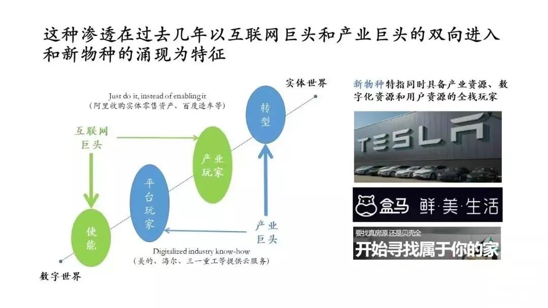 传统企业也有两种选项,比如美的、三一重工和海尔等,除了进行数字化转型,还可以做平台玩家。企业原有的部门剥离出来,转向跨行业的平台服务。美的有“美云数字”,三一重工有“数工互联”等。这些传统企业在各自领域的专业度有口皆碑,它们也希望把自己的专业知识传递到边界外的企业。这样一种渗透造就了大量像特斯拉、盒马、贝壳这种从传统行业孵化的“新物种”。