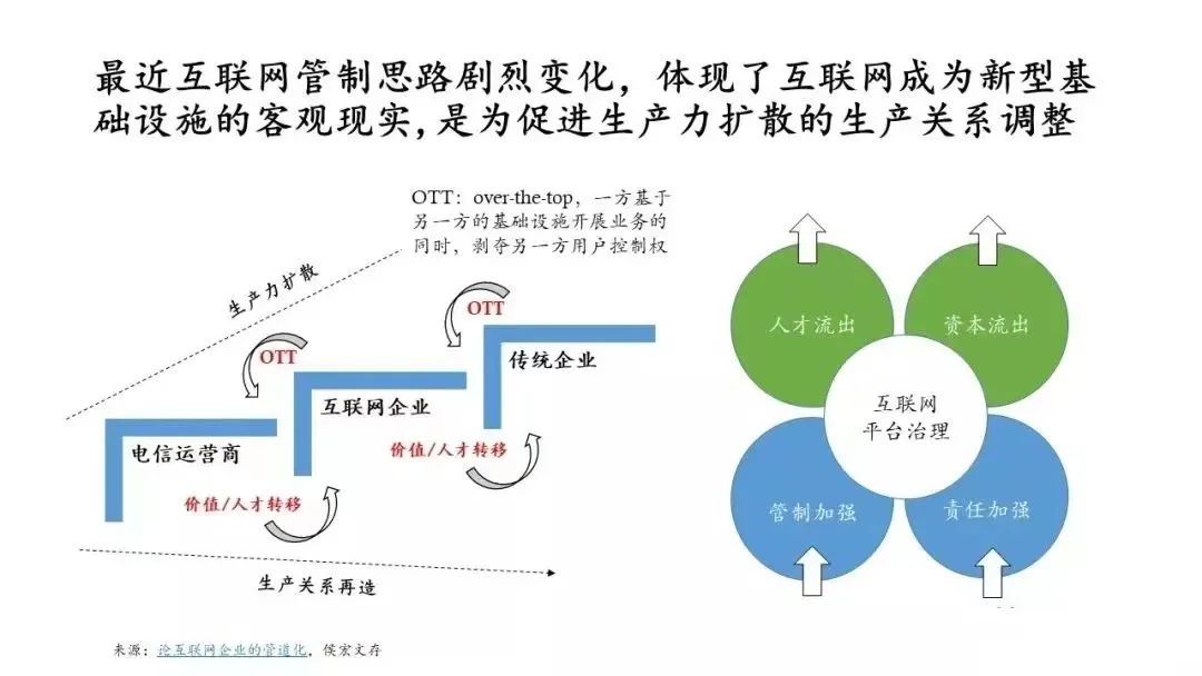 曾几何时,电信企业面临着互联网企业的OTT(over the top),即互联网企业用着运营商的网络,不仅赚的钱比运营商多,用户还只知互联网,不知运营商。时至今日,互联网企业正在沦落为当年的运营商,它们正在被传统企业管道化,客观上体现了互联网企业作为新型基础设施的定位。互联网企业扮演着新型基础设施的角色,但其承载的是各行各业的传统企业。互联企业正在转变为传统企业,传统企业正在转变为互联网企业,这将是数字化转型下的常态。