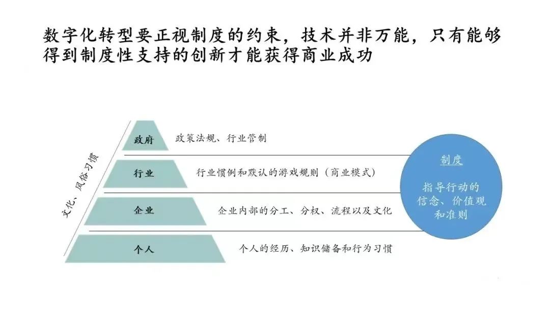 不论是新企业还是旧企业,数字化转型时一定要树立一种观念:技术并非万能,要正视数字化的约束,才能取得商业上的成功。为什么会存在约束?行业内部存在默认的游戏规则,没那么容易被颠覆,毕竟资源都掌握在行业玩家的手上,后来者想要破窗就一定会受到约束。那种高喊“我要颠覆你”的英雄时代,可能已经过去了。