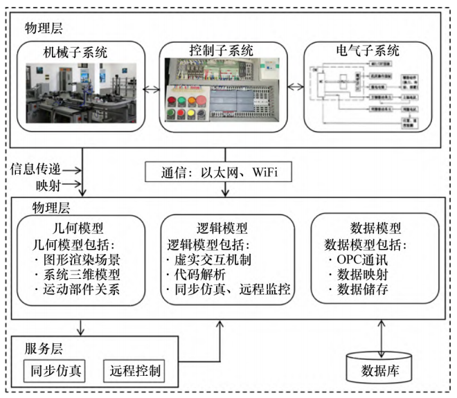 服务层主要由远程控制和同步仿真两部分组成。同步仿真可以对物理系统的运行状态实时监控,作为性能评估的参考。远程控制则是通过数字孪生系统发送信号控制实际系统,实现反向控制,用于异常处理。物理层和数据孪生层是通过 WiFi 或以太网通行完成信息交互,并利用数据库存储或读取数据。