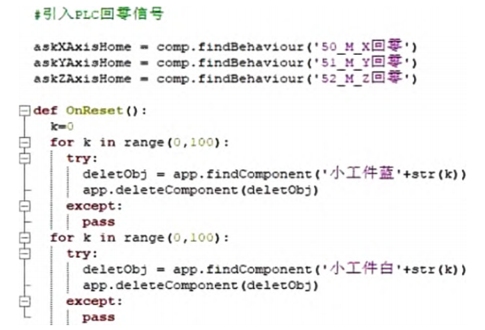 (2) 逻辑模型主要是用来建立与实体模型一致的动态加工过程,构建虚拟柔性制造系统。逻辑模型还要实现数字孪生模型的同步仿真和远程控制。为了使虚拟系统能准确模拟运行过程,需要将实体模型的各类代码,如梯形图等进行识别与解析,代码解析如图2所示。
