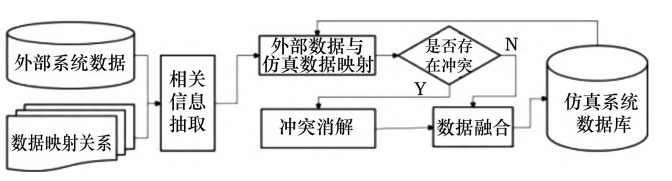 数据接入流程如图 3 所示,首先确定从实体设备获得的数据信息,并确定数据映射关系。其次将数据映射关系和外部系统数据进行比较,确定从外部系统需要抽取的相关信息。然后将仿真数据和外部数据进行映射,匹配为对。若两者数据存在冲突,则消解冲突在虚拟系统中增加或删除相应的数据信号。若两者数据不存在冲突,则进行数据融合。