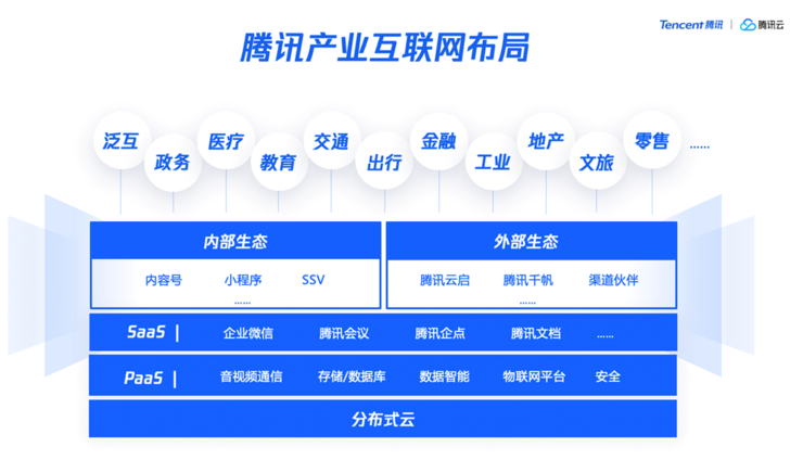 未来产业互联网的推进,重点体现在三方面:一是底盘要够“厚”,基础技术要足够丰富和有效,才能撑得住上层的各种需求。腾讯基于20多年的技术积累,已整合云、AI、5G、IoT、大数据、安全等关键技术能力,组成工具箱开放给各行各业加速升级。二是中台要够“智”,通过智慧中台打通企业的各领域,帮助企业更智能开展生产经营。腾讯将大规模用户运营和服务中积累的技术和数据中台能力对外输出,已帮助很多地方和企业成功打造了中台化的智慧运营体系。三是生态要够“活”,未来各行各业都会在数字化过程中形成新生态,也需要通过生态共赢的方式实现可持续发展。腾讯一直是生态开放合作的提倡者,积极推动生态建设全方位助力企业数字化转型。目前腾讯的产业生态合作伙伴数量已突破9000家,打造了超过400个行业的解决方案,提供渠道、服务、咨询、研发等各领域支持,覆盖工业、农业、公共服务、医疗、教育、出行、金融、零售等30多个行业。