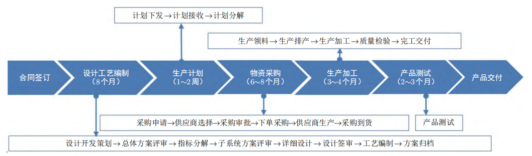 作为一个复杂的电子装备,从合同签订至产品交付,整个项目周期持续约22 ~ 25个月,其整体业务流程及每个子业务的基本流程如图3所示。项目实施过程涉及企业内多个部门,审批流程多,周期长。另外,业务过程复杂多变,沟通协调难度大。