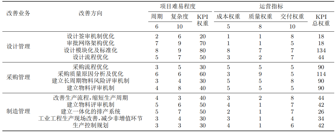 通过对项目过程中各业务流程的问题进行分析,梳理存在的问题,提出改善建议。同时对设计管理、采购管理和制造管理3大业务的改善方向及KPI指标进行分析,具体见表1。