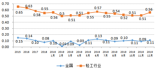 2019年,作为传统的强贸易竞争力行业,轻工业贸易竞争力指数0.54,较2018年基本持平,年底末月指数出现明显提升。全年,轻工业贸易竞争力指数虽延续连续4年稳中有降,但降幅明显较前两年有所降低,仅有0.01点的降幅,表明轻工业贸易竞争力有所回升。