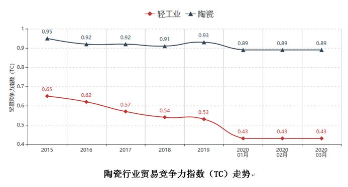 2020年3月陶瓷行业贸易竞争力指数为0.89