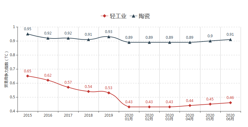 2020年6月陶瓷行业贸易竞争力指数0.91