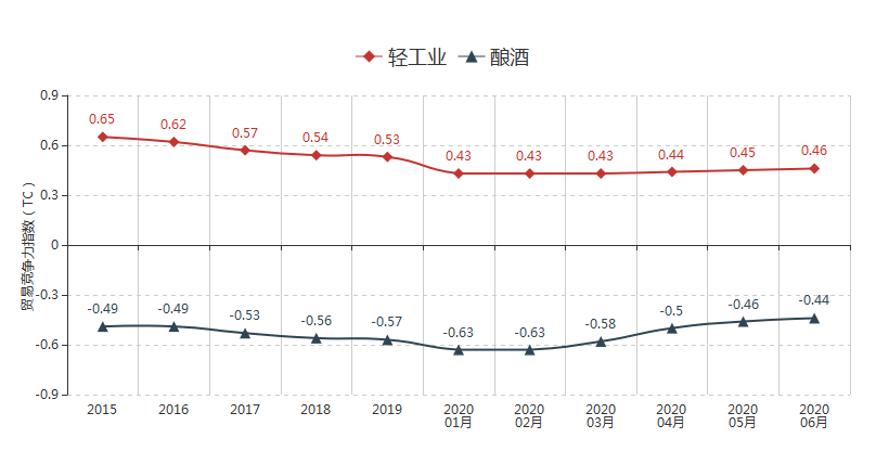 2015年以来,中国酿酒行业进口贸易额持续高于出口贸易额,TC贸易竞争力指数持续在负值区间运行,行业国际贸易竞争力较弱。2020年酿酒行业贸易竞争力指数小幅上升,6月份该指数为-0.44,较2019年末提高0.13点,但仍比同期轻工业平均值低0.9点。