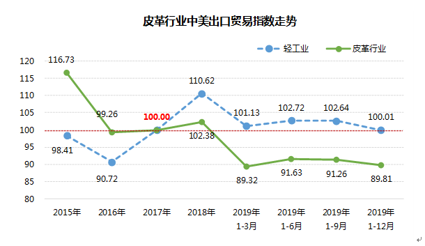 2017年,皮革、毛皮及制鞋行业对美国累计出口额为187.9亿美元,2018年为192.3亿美元,2019年为168.71亿美元。皮革行业中美出口贸易指数自2015年以来呈震荡下行走势,2019年持续在100临界值以下,表明行业对美出口额已低于贸易战发生前同期水平,行业对美出口受中美经贸摩擦影响较大。2019年1-12月,皮革、毛皮及制鞋行业中美出口贸易指数89.81,低于同期轻工业中美出口贸易指数10.2点,较1-9月下降1.45点。