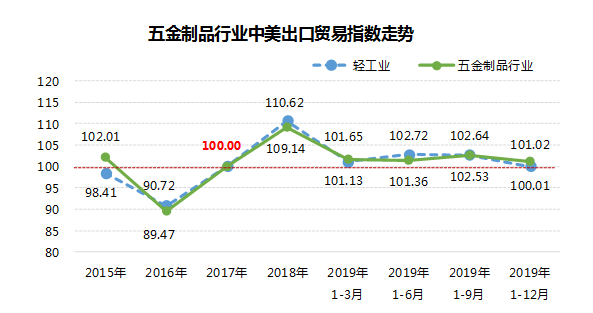2019年1-12月五金行业中美出口贸易指数101.02
