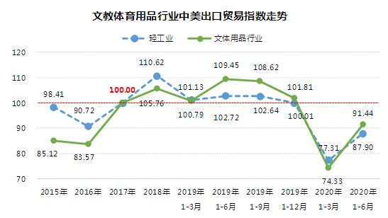 2020年1-6月文教体育用品行业中美出口贸易指数91.44