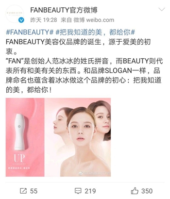3月1日,范冰冰自创品牌FANBEAUTY美容仪品牌诞生,预示着范冰冰开始涉足化妆品领域。