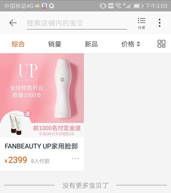 同时FANBEAUTY还在天猫开设了官方旗舰店,目前只有FANBEAUTY UP家用脸部射频电子美容仪器范冰冰童颜机一款产品在手,根据,销售页面显示,该美容仪原价3299元,预售价2399元,但需要支付200元定金,具体发货时间为3月25日,并且限量1000支,目前显示已有8人付款。