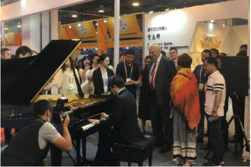 图为俄罗斯前第一副总理驻足展区,欣赏了新濠天地控股集团木毯教育创始人/著名盲人钢琴家孙岩演奏的钢琴曲《喀秋莎》,并对其大加赞扬。民族文化品牌“长江钢琴”作为京交会工匠精神特色小镇的指定用琴。受到了各国领导们的高度关注和好评,寄语希望中国可以有更多的民族品牌从这里走向世界。