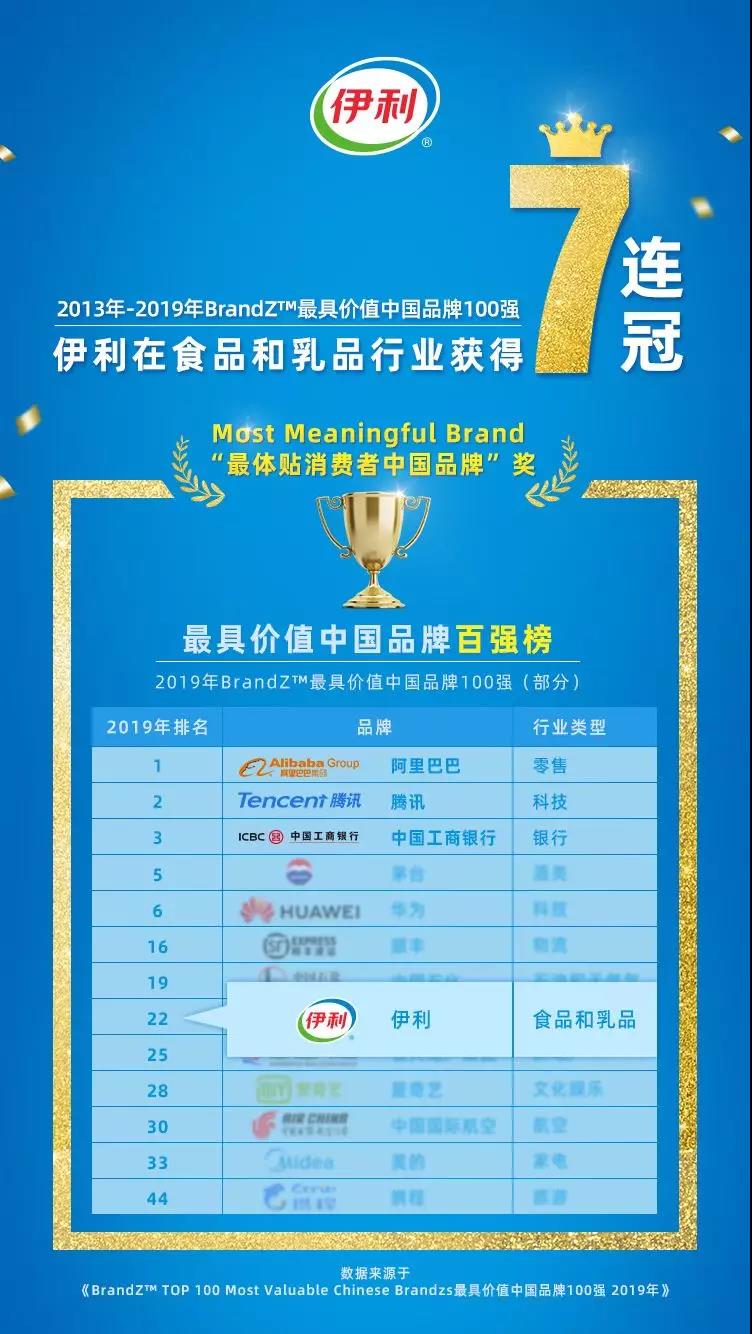 5月6日,“2019年BrandZ™最具价值中国品牌100强”榜单揭晓,伊利品牌在食品和乳品行业排名第一,品牌价值同比增长19%,实现了“七冠王”,并获得BrandZ™“Most Meaningful Brand-最体贴消费者中国品牌”称号。