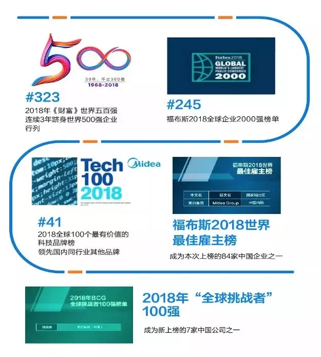 2018年,美的连续三年跻身世界500强行列、位列福布斯全球企业200强榜单、被评为全球100个最有价值的科技品牌榜……以实力扩展全球影响力,塑造中国品牌在全球制造业的全新形象。