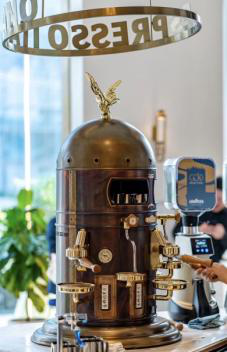很多消费者,进店后都会第一眼被柜台上那个“黄铜的大钟”所以吸引。这台全球限量70台的古董咖啡机——Elektra Belle Epoque,源于世界上第一台Espresso咖啡机,全手工打造,它保留了古老的外衣和顶级的操作感,经过Lavazza工程师重新设计的内部机械既保证了咖啡口味的醇正,也有效的减少了咖啡师在冲泡咖啡过程中对手腕造成的职业伤害。