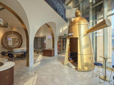 在意大利,人们习惯早晨起床用摩卡壶煮一杯香浓的咖啡,随着浓郁的咖啡香弥漫在屋中,美好的一天随即开启。摩卡壶被认为是“Made in Italy”的标志之一,也是意式咖啡文化最重要的组成部分。现在,Lavazaa也贴心的把它带到了中国,在上海旗舰店,一款由著名设计师马克·赞努索(Marco Zanuso)1979年为Lavazza设计的金色Lavazza Carmencita摩卡壶装置占据了C位,消费者可以坐在这个巨大的摩卡壶里喝咖啡,也可以拍照留念。