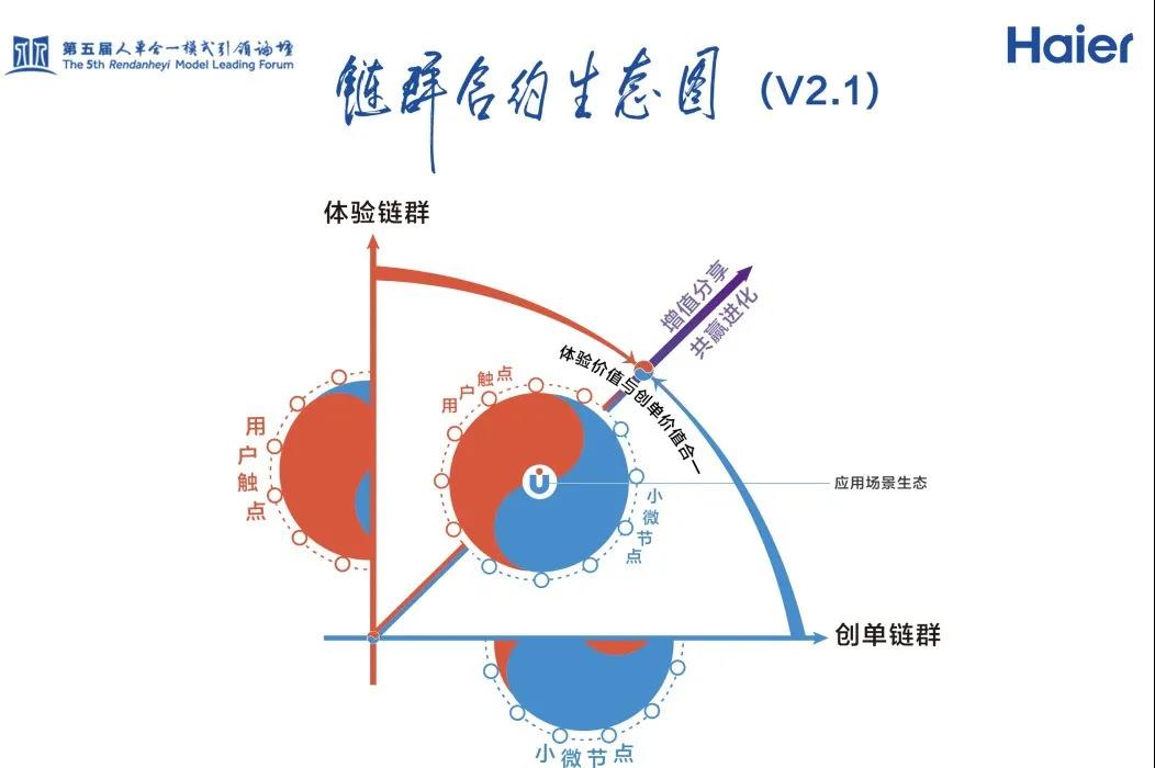 链群合约的生态是完全颠覆了科层制的。过去是研发、制造、是销售、售后、人力等部门,但现在变成一个个小微,小微围着用户转,聚合成链群。一类叫做体验链群,就是直接和用户接触的;一类叫做创单链群,是创造用户价值的。体验链群发用户的一个需求,与创单链群融合,创单链群创造后,马上感知用户体验,根据用户反馈迭代优化,这也体现了零距离。这中间没有层级汇报。所以,链群合约,既是一个创造性的破坏,也是创造性的重组。