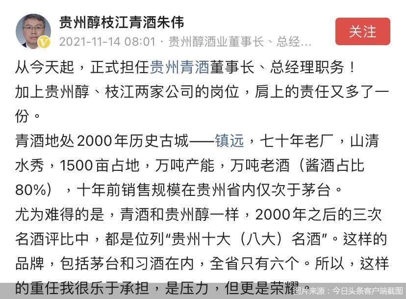 11月14日早间,朱伟在个人社交平台上宣布正式担任贵州青酒董事长、总经理职务。值得注意的是,两个月前,贵州醇才刚刚完成与江苏综艺集团旗下的三际投资公司共同全资收购巨型酱酒企业——四川蔺郎酒业集团。