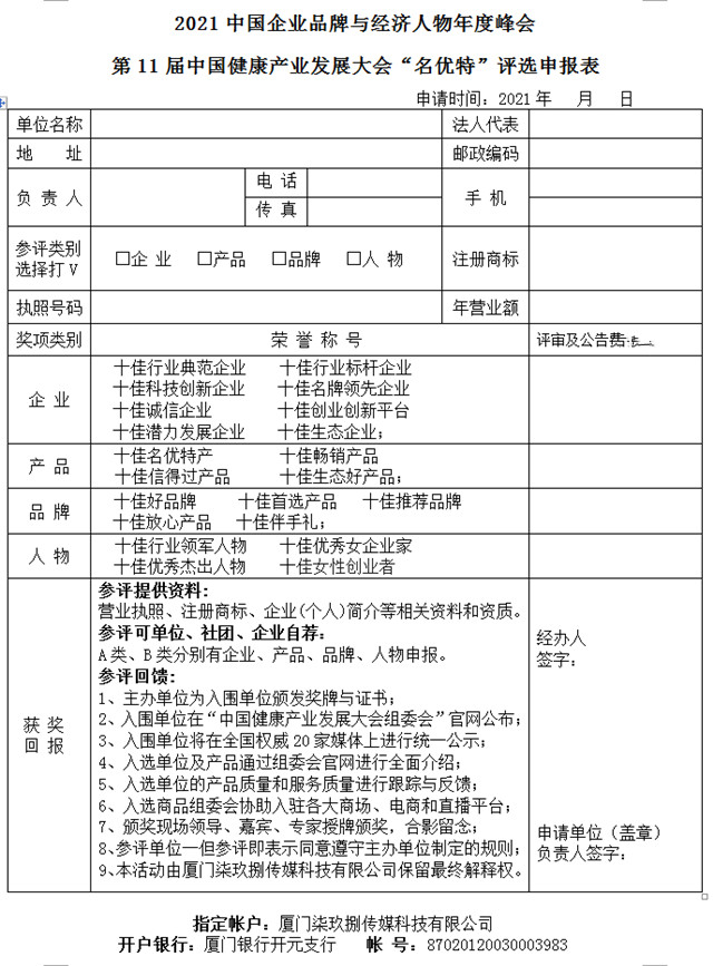 2021又是一个不平凡的一年,但总有一部份企业和企业家迎难而上,作岀卓越成绩,树榜样立标杆,提升品牌影响力,推动企业创新与转型升级促进发展,使企业更强更大,为此,由中国管理科学院品牌推进委员会指导,中国健康产业发展大会组委会、中国新媒体发展大会组委会联合主办,厦门柒玖捌传媒科技有限公司、中健惠民(厦门)健康科技股份有限公司策划承办,盛世无极(厦门)科技有限公司、中区财经、茶宝商城、茶酒产业联盟、六月天实业、读多多教育协办的2021中国企业品牌与经济人物年度峰会暨第十一届中国健康产业发展大会“名优特”评选全国展开征募!颁奖盛典与年度峰会将于2022年01月15日在厦门召开。