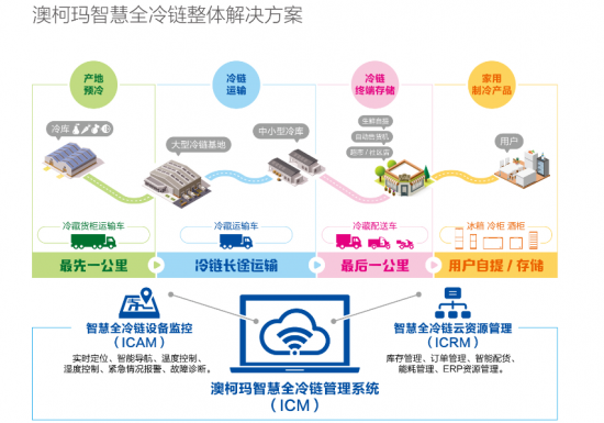 澳柯玛依托多年来在制冷产业链的布局,持续聚焦做强做大制冷细分产业基础上,积极将制冷产业与互联网融合,提出并实施了“互联网+全冷链”战略实施,完成了家庭冷链、商超便利、酒店厨房、生鲜自提、生物医疗、冷库存储、冷藏运输的全冷链产业布局,借助物联网、大数据、云计算等技术,搭建了集设备监控、货品管理、资源共享、订单交易于一体的冷链物联网管理平台、疫苗全冷链管理平台,实现了对终端设备的远程监控、控制及云资源管理。