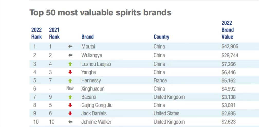“50大烈酒品牌”(Spirits 50)总价值1426亿美元,中国10个品牌上榜,价值976亿美元,占比68.4%。茅台、五粮液、泸州老窖、洋河包揽前四名。