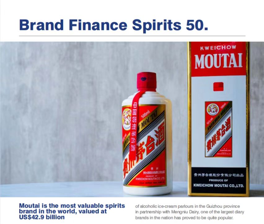 Brand Finance早前在英国伦敦发布的《Brand Finance2022年度全球最具价值烈酒品牌50强》榜单及报告认为,世界上最具价值的烈酒品牌是茅台,这是一种由高粱发酵而成的白酒。