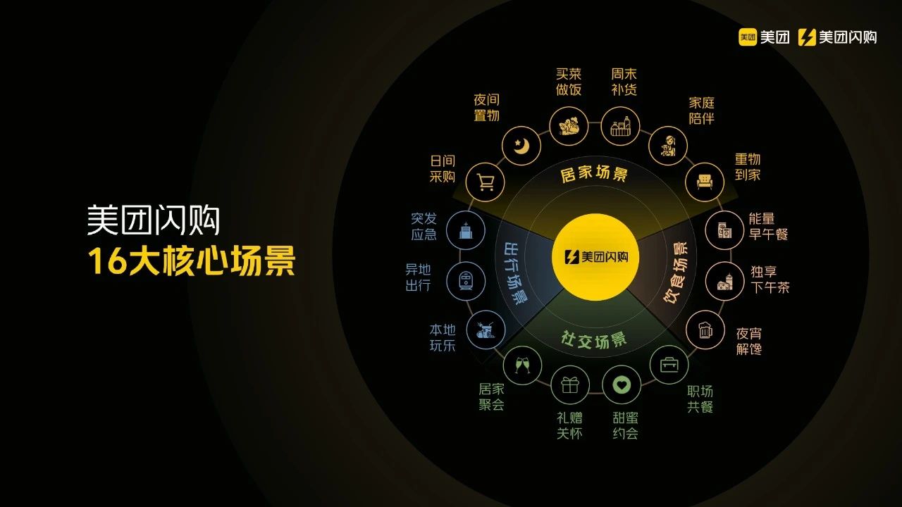 我们通过系统化的建模方法,建立了美团闪购的16大核心场景。通过这16个场景,我们描述了用户在24小时内的主要活动。这些场景分为四大板块:居家、饮食、社交和出行。