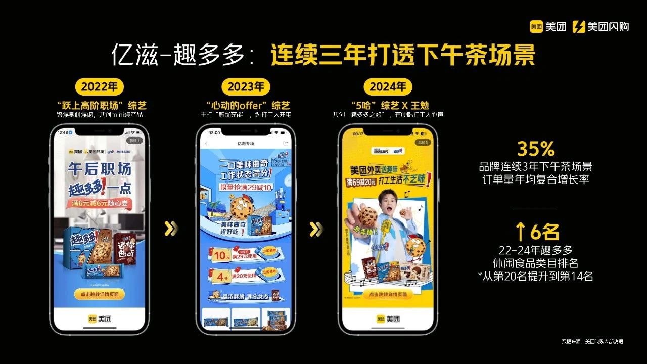 在没有场景衡量工具之前,很多策略都是凭直觉进行的,缺乏量化指标。然而,有了场景工具后,经过三年的持续投资和努力,我们发现其策略确实非常具有战略性。在下午茶场景中,趣多多连续三年在美团闪购的复购增长率达到35%。在下午茶这个场景中,趣多多的品牌排名提升了六位,这表明他们的投资非常有效。