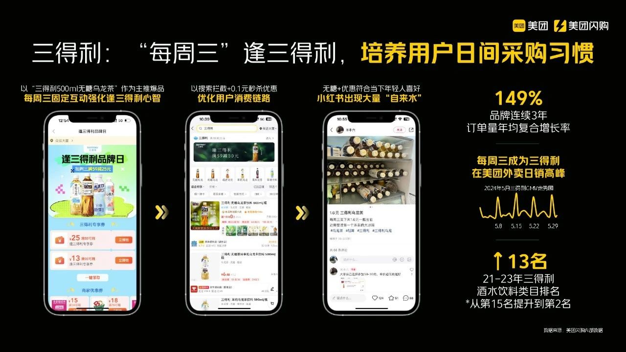 再以三得利为例。过去三年,三得利的增长速度非常快,年复合增长率达到150%。在这期间,三得利坚持推动一种消费习惯,即希望用户在日间采购时选择其茶饮料作为日常补货。因此,三得利连续三年在美团闪购平台上每周三进行大额补贴活动,旨在培养用户的消费习惯。这一活动不仅在我们的平台上进行,可能还伴随外部广告的支持。通过这种持续地努力,三得利成功地将每周三打造成其独特的销售高峰期,尽管对我们平台来说,周末通常才是订单高峰。